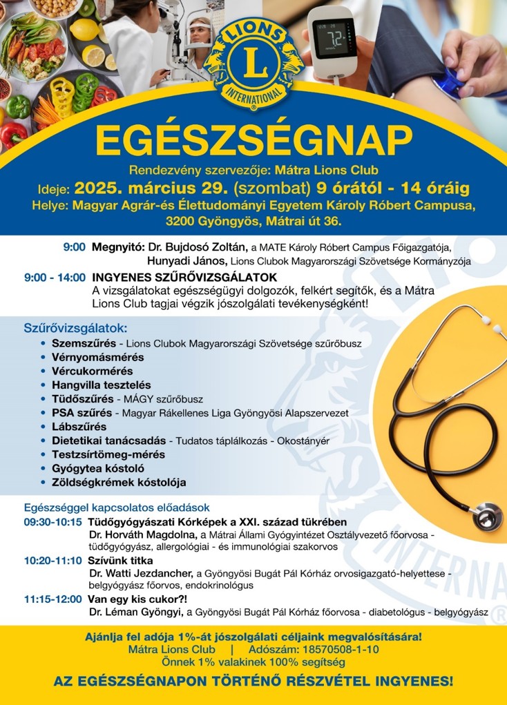 A 2024-2025-ös pályázati kiírás győztese a Gyöngyös Mátra Lions Club. A Club egészségnapjáról készített pályázat és a balatonkenesei országos képzésen bemutatott prezentáció letölthető alul a dokumentumtárból. |